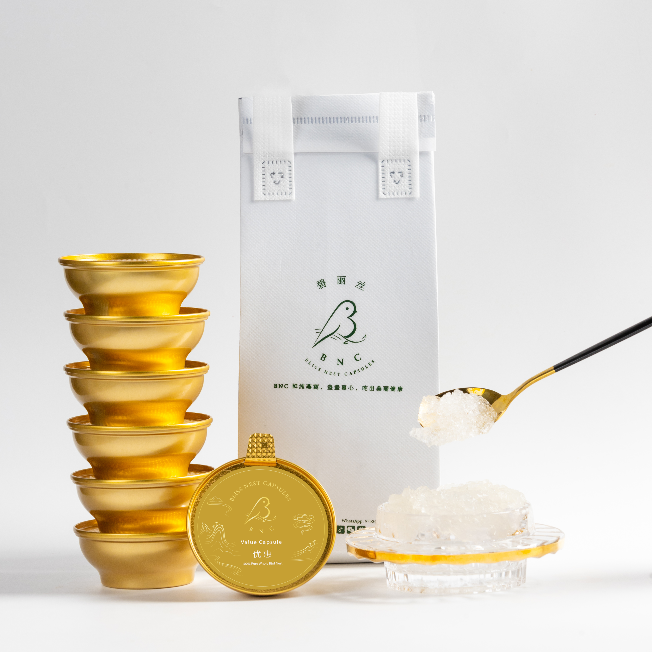 - Freshly stewed bird’s nest capsules are delivered weekly — ready to enjoy chilled.
